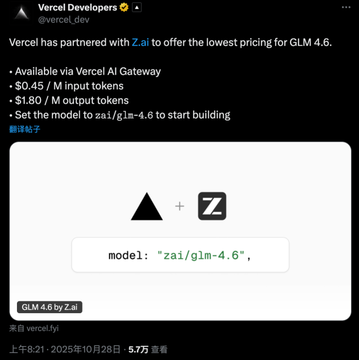 更重磅的是,估值高达93亿美元的美国公司Vercel近日公开宣布,已和智谱达成合作,在其平台上提供GLM-4.6的API服务。其老板GuillermoRauch更是转发称赞GLM4.6“很好,在http://nextjs.org/evals上排名第三,还是前五名里唯一开源的模型”。